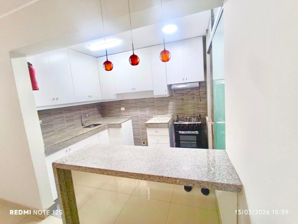 La **cocina cuenta con reposteros altos y bajos**, ofreciendo buen espacio de almacenamiento, y el departamento incluye **área de lavandería con tendedero** para mayor practicidad.