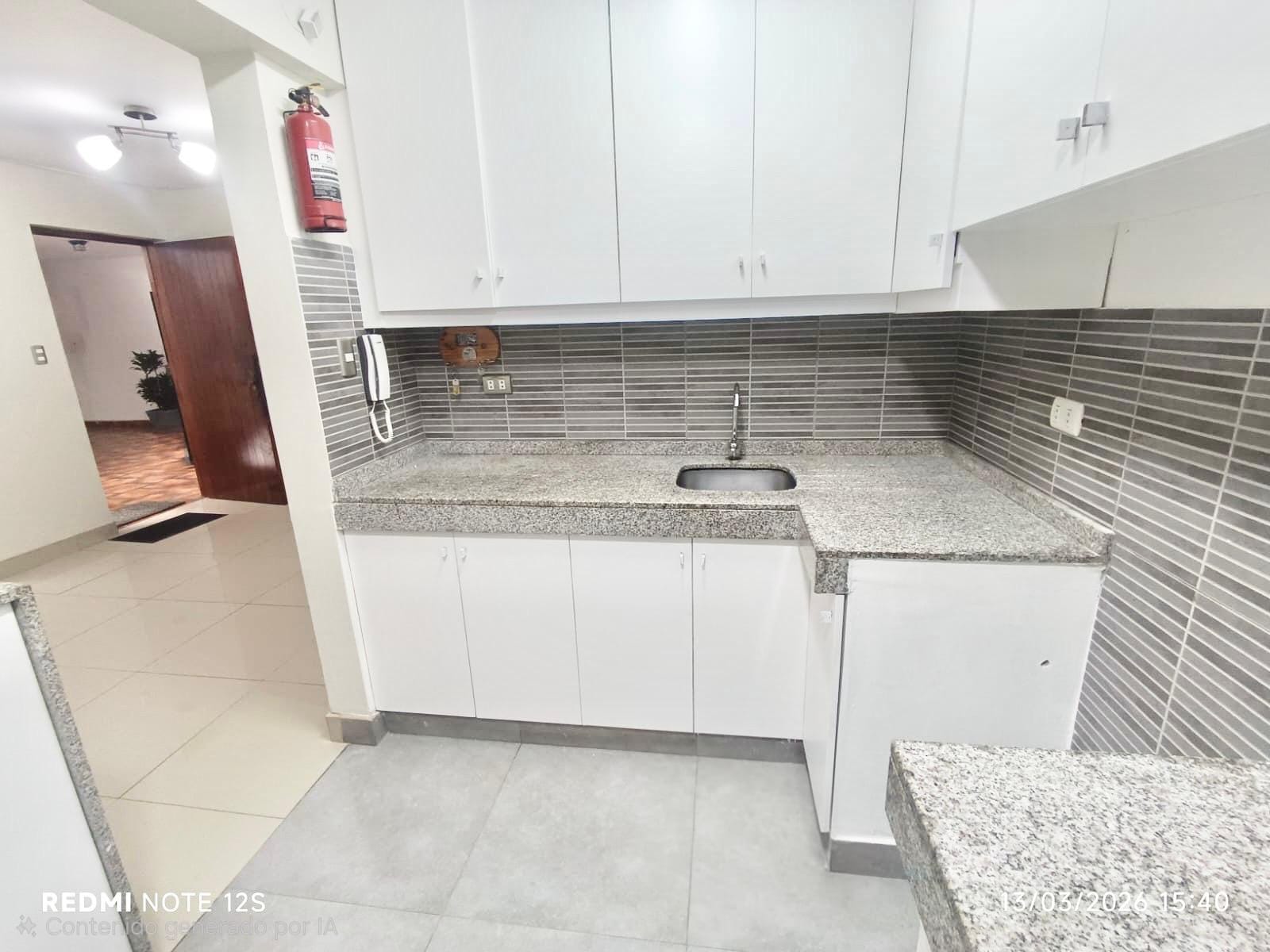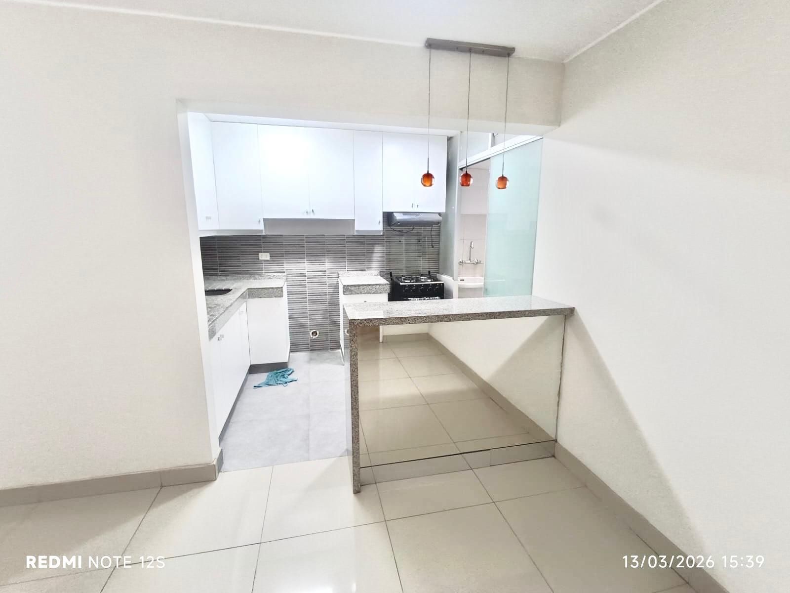 La **cocina cuenta con reposteros altos y bajos**, ofreciendo buen espacio de almacenamiento, y el departamento incluye **área de lavandería con tendedero** para mayor practicidad.